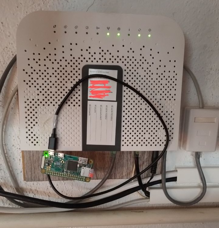 Raspberry Pi alimentada por el router y pegada al mismo con cinta de doble cara.
