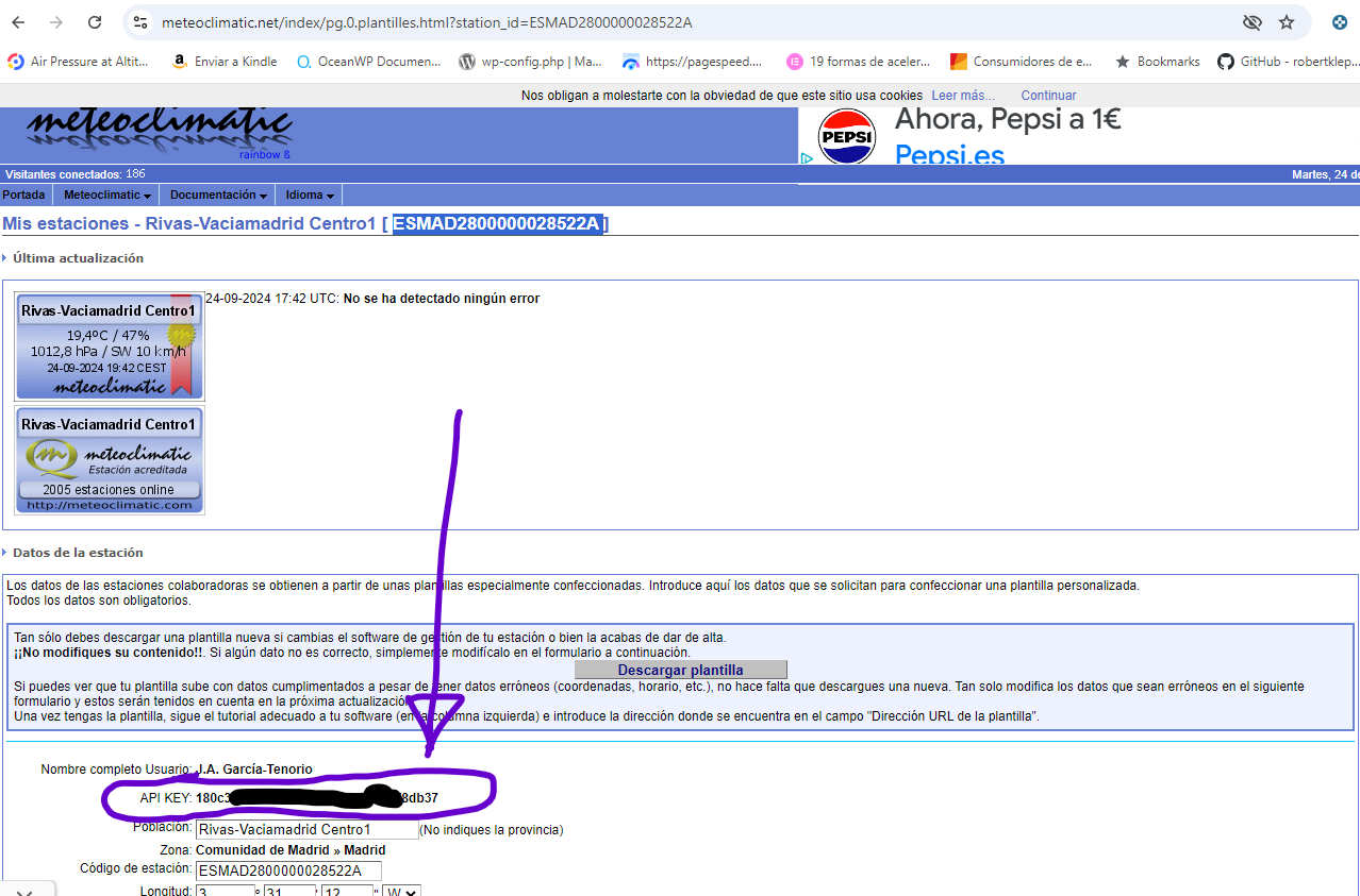 - La APi KEY de Meteoclimatic Rainbow, que podrás encontrar en Meteoclimatic, una vez identificado, haciendo click en una de tus estaciones