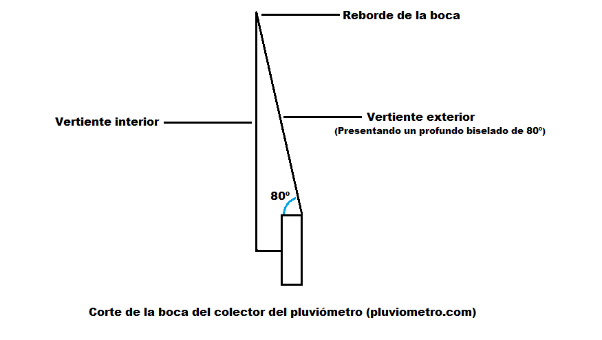 El otro error es el borde, Todas las norma hablan de que el borde tiene que ser un filo, no una superficie plana. La idea es que el borde tenga una medida exacta, y el borde esté tan afilado que sea capaz de "cortar" una gota de agua para que no haya salpicaduras. Pongo una captura de lo que sería la sección ideal del borde de un pluviómetro, (De pluviometro.com)