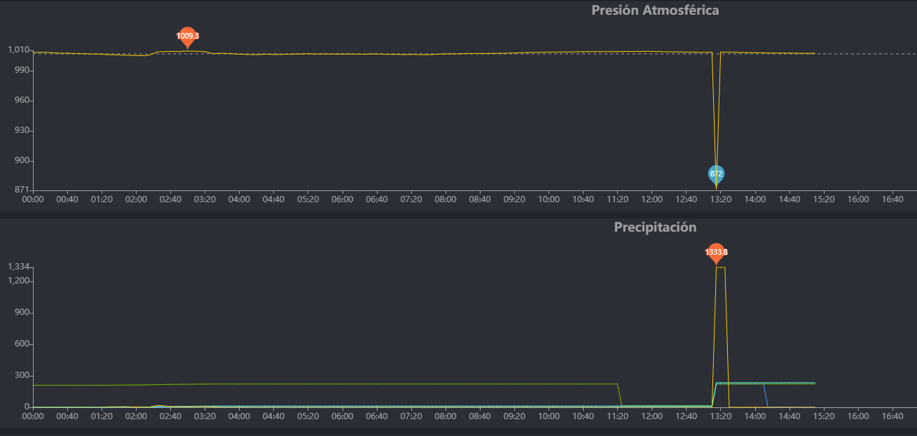 Pero ojo, esta OTA viene con un error que hace que te sume 222 mm al pluviómetro y te desplome el barómetro al mínimo. Ayer ya me pasó y esta mañana igual: