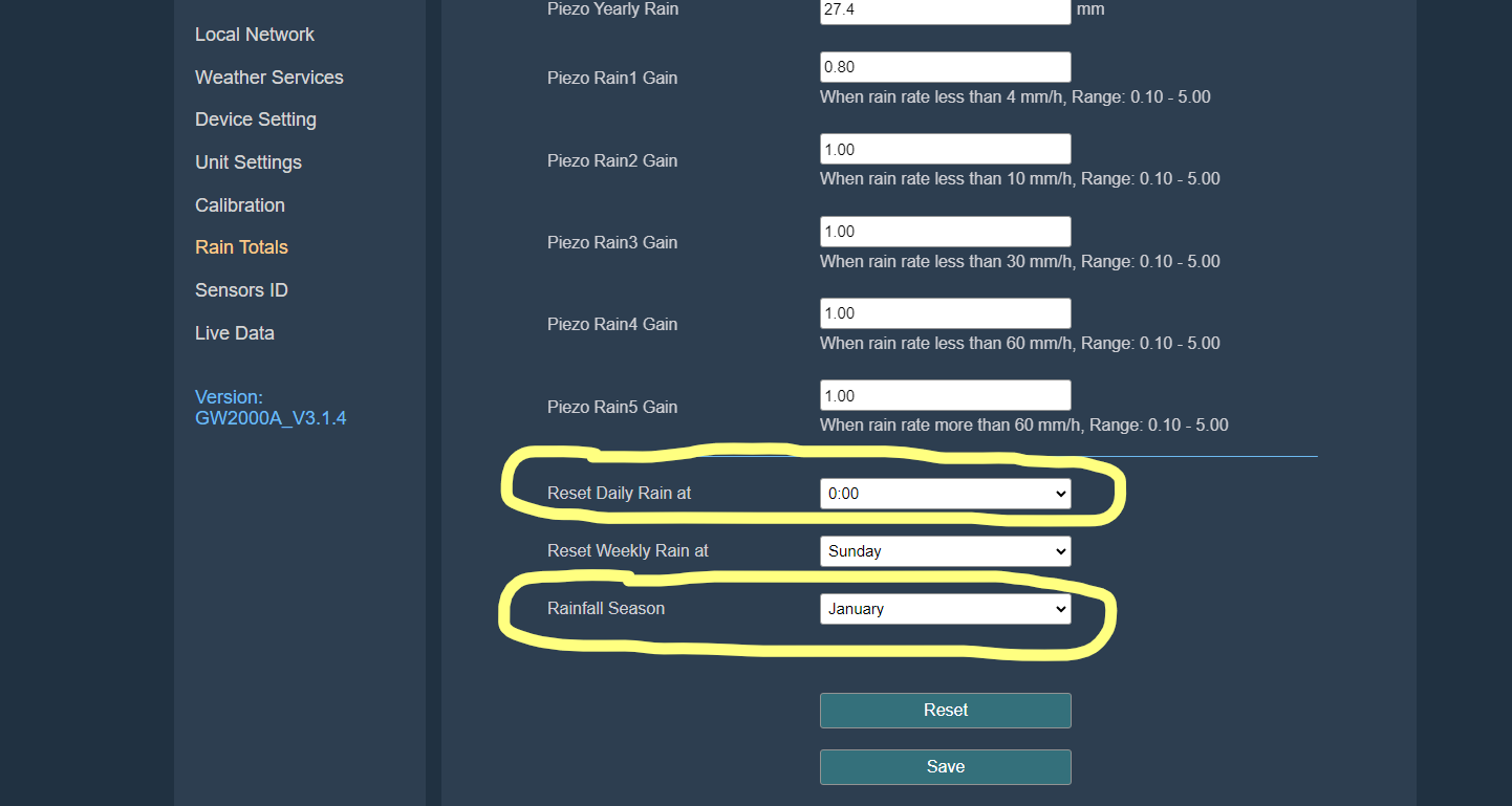 En el caso de las consolas y gateways modernas, lo más cómodo es hacerlo con el interface web. El ajuste está en la pestaña del menu "Rain Totals"
