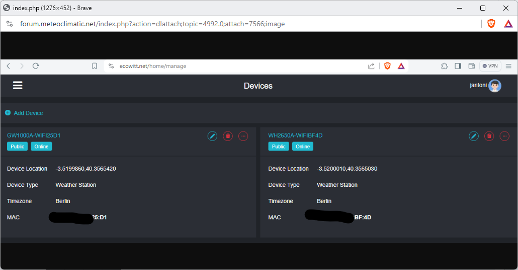 Nos interesa saber la dirección MAC de la consola o gateway que vamos a usar con ComulusMX, ya que es el dispositivo del que obtendrá los datos que CumulusMX haya perdido por algún motivo. Es decir, ecowitt.net es nuestro datalogger en la nube.